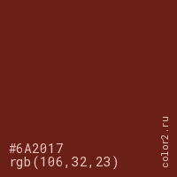 Цвет #6A2017 в цветовой модели RGB обозначается тремя октетами (106, 32, 23) в десятичном формате и #6A2017 в шестнадцатиричном (hex) формате, которые являются интенсивностью красного 106 (hex 6A), интенсивность зелёного 32 (hex 20) и интенсивность синего 23 (hex 17).