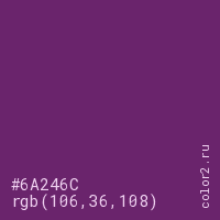 Цвет #6A246C в цветовой модели RGB обозначается тремя октетами (106, 36, 108) в десятичном формате и #6A246C в шестнадцатиричном (hex) формате, которые являются интенсивностью красного 106 (hex 6A), интенсивность зелёного 36 (hex 24) и интенсивность синего 108 (hex 6C).