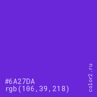 Цвет #6A27DA в цветовой модели RGB обозначается тремя октетами (106, 39, 218) в десятичном формате и #6A27DA в шестнадцатиричном (hex) формате, которые являются интенсивностью красного 106 (hex 6A), интенсивность зелёного 39 (hex 27) и интенсивность синего 218 (hex DA).