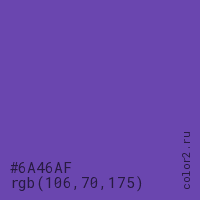 Цвет #6A46AF в цветовой модели RGB обозначается тремя октетами (106, 70, 175) в десятичном формате и #6A46AF в шестнадцатиричном (hex) формате, которые являются интенсивностью красного 106 (hex 6A), интенсивность зелёного 70 (hex 46) и интенсивность синего 175 (hex AF).