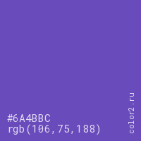Цвет #6A4BBC в цветовой модели RGB обозначается тремя октетами (106, 75, 188) в десятичном формате и #6A4BBC в шестнадцатиричном (hex) формате, которые являются интенсивностью красного 106 (hex 6A), интенсивность зелёного 75 (hex 4B) и интенсивность синего 188 (hex BC).