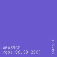 Цвет #6A59CE в цветовой модели RGB обозначается тремя октетами (106, 89, 206) в десятичном формате и #6A59CE в шестнадцатиричном (hex) формате, которые являются интенсивностью красного 106 (hex 6A), интенсивность зелёного 89 (hex 59) и интенсивность синего 206 (hex CE).