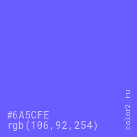Цвет #6A5CFE в цветовой модели RGB обозначается тремя октетами (106, 92, 254) в десятичном формате и #6A5CFE в шестнадцатиричном (hex) формате, которые являются интенсивностью красного 106 (hex 6A), интенсивность зелёного 92 (hex 5C) и интенсивность синего 254 (hex FE).