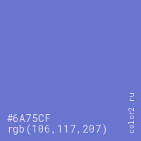 Цвет #6A75CF в цветовой модели RGB обозначается тремя октетами (106, 117, 207) в десятичном формате и #6A75CF в шестнадцатиричном (hex) формате, которые являются интенсивностью красного 106 (hex 6A), интенсивность зелёного 117 (hex 75) и интенсивность синего 207 (hex CF).