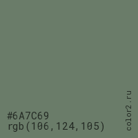 Цвет #6A7C69 в цветовой модели RGB обозначается тремя октетами (106, 124, 105) в десятичном формате и #6A7C69 в шестнадцатиричном (hex) формате, которые являются интенсивностью красного 106 (hex 6A), интенсивность зелёного 124 (hex 7C) и интенсивность синего 105 (hex 69).