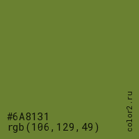 Цвет #6A8131 в цветовой модели RGB обозначается тремя октетами (106, 129, 49) в десятичном формате и #6A8131 в шестнадцатиричном (hex) формате, которые являются интенсивностью красного 106 (hex 6A), интенсивность зелёного 129 (hex 81) и интенсивность синего 49 (hex 31).