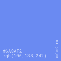 Цвет #6A8AF2 в цветовой модели RGB обозначается тремя октетами (106, 138, 242) в десятичном формате и #6A8AF2 в шестнадцатиричном (hex) формате, которые являются интенсивностью красного 106 (hex 6A), интенсивность зелёного 138 (hex 8A) и интенсивность синего 242 (hex F2).