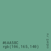 Цвет #6AA58C в цветовой модели RGB обозначается тремя октетами (106, 165, 140) в десятичном формате и #6AA58C в шестнадцатиричном (hex) формате, которые являются интенсивностью красного 106 (hex 6A), интенсивность зелёного 165 (hex A5) и интенсивность синего 140 (hex 8C).