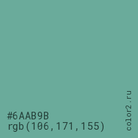 Цвет #6AAB9B в цветовой модели RGB обозначается тремя октетами (106, 171, 155) в десятичном формате и #6AAB9B в шестнадцатиричном (hex) формате, которые являются интенсивностью красного 106 (hex 6A), интенсивность зелёного 171 (hex AB) и интенсивность синего 155 (hex 9B).