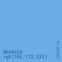 Цвет #6AACE8 в цветовой модели RGB обозначается тремя октетами (106, 172, 232) в десятичном формате и #6AACE8 в шестнадцатиричном (hex) формате, которые являются интенсивностью красного 106 (hex 6A), интенсивность зелёного 172 (hex AC) и интенсивность синего 232 (hex E8).