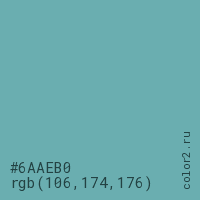 Цвет #6AAEB0 в цветовой модели RGB обозначается тремя октетами (106, 174, 176) в десятичном формате и #6AAEB0 в шестнадцатиричном (hex) формате, которые являются интенсивностью красного 106 (hex 6A), интенсивность зелёного 174 (hex AE) и интенсивность синего 176 (hex B0).