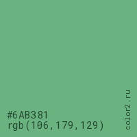 Цвет #6AB381 в цветовой модели RGB обозначается тремя октетами (106, 179, 129) в десятичном формате и #6AB381 в шестнадцатиричном (hex) формате, которые являются интенсивностью красного 106 (hex 6A), интенсивность зелёного 179 (hex B3) и интенсивность синего 129 (hex 81).
