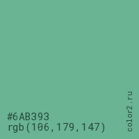 Цвет #6AB393 в цветовой модели RGB обозначается тремя октетами (106, 179, 147) в десятичном формате и #6AB393 в шестнадцатиричном (hex) формате, которые являются интенсивностью красного 106 (hex 6A), интенсивность зелёного 179 (hex B3) и интенсивность синего 147 (hex 93).