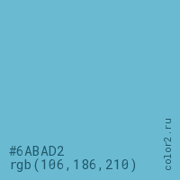 Цвет #6ABAD2 в цветовой модели RGB обозначается тремя октетами (106, 186, 210) в десятичном формате и #6ABAD2 в шестнадцатиричном (hex) формате, которые являются интенсивностью красного 106 (hex 6A), интенсивность зелёного 186 (hex BA) и интенсивность синего 210 (hex D2).
