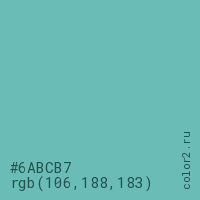 Цвет #6ABCB7 в цветовой модели RGB обозначается тремя октетами (106, 188, 183) в десятичном формате и #6ABCB7 в шестнадцатиричном (hex) формате, которые являются интенсивностью красного 106 (hex 6A), интенсивность зелёного 188 (hex BC) и интенсивность синего 183 (hex B7).