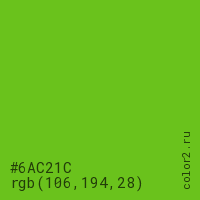 Цвет #6AC21C в цветовой модели RGB обозначается тремя октетами (106, 194, 28) в десятичном формате и #6AC21C в шестнадцатиричном (hex) формате, которые являются интенсивностью красного 106 (hex 6A), интенсивность зелёного 194 (hex C2) и интенсивность синего 28 (hex 1C).