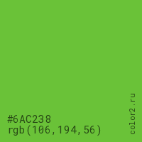 Цвет #6AC238 в цветовой модели RGB обозначается тремя октетами (106, 194, 56) в десятичном формате и #6AC238 в шестнадцатиричном (hex) формате, которые являются интенсивностью красного 106 (hex 6A), интенсивность зелёного 194 (hex C2) и интенсивность синего 56 (hex 38).