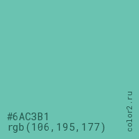 Цвет #6AC3B1 в цветовой модели RGB обозначается тремя октетами (106, 195, 177) в десятичном формате и #6AC3B1 в шестнадцатиричном (hex) формате, которые являются интенсивностью красного 106 (hex 6A), интенсивность зелёного 195 (hex C3) и интенсивность синего 177 (hex B1).