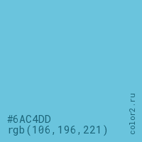 Цвет #6AC4DD в цветовой модели RGB обозначается тремя октетами (106, 196, 221) в десятичном формате и #6AC4DD в шестнадцатиричном (hex) формате, которые являются интенсивностью красного 106 (hex 6A), интенсивность зелёного 196 (hex C4) и интенсивность синего 221 (hex DD).