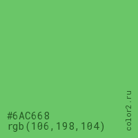 Цвет #6AC668 в цветовой модели RGB обозначается тремя октетами (106, 198, 104) в десятичном формате и #6AC668 в шестнадцатиричном (hex) формате, которые являются интенсивностью красного 106 (hex 6A), интенсивность зелёного 198 (hex C6) и интенсивность синего 104 (hex 68).
