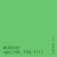 Цвет #6AC66F в цветовой модели RGB обозначается тремя октетами (106, 198, 111) в десятичном формате и #6AC66F в шестнадцатиричном (hex) формате, которые являются интенсивностью красного 106 (hex 6A), интенсивность зелёного 198 (hex C6) и интенсивность синего 111 (hex 6F).