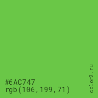 Цвет #6AC747 в цветовой модели RGB обозначается тремя октетами (106, 199, 71) в десятичном формате и #6AC747 в шестнадцатиричном (hex) формате, которые являются интенсивностью красного 106 (hex 6A), интенсивность зелёного 199 (hex C7) и интенсивность синего 71 (hex 47).