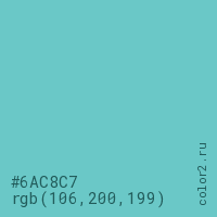 Цвет #6AC8C7 в цветовой модели RGB обозначается тремя октетами (106, 200, 199) в десятичном формате и #6AC8C7 в шестнадцатиричном (hex) формате, которые являются интенсивностью красного 106 (hex 6A), интенсивность зелёного 200 (hex C8) и интенсивность синего 199 (hex C7).