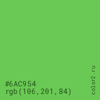 Цвет #6AC954 в цветовой модели RGB обозначается тремя октетами (106, 201, 84) в десятичном формате и #6AC954 в шестнадцатиричном (hex) формате, которые являются интенсивностью красного 106 (hex 6A), интенсивность зелёного 201 (hex C9) и интенсивность синего 84 (hex 54).
