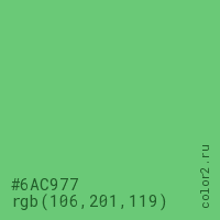 Цвет #6AC977 в цветовой модели RGB обозначается тремя октетами (106, 201, 119) в десятичном формате и #6AC977 в шестнадцатиричном (hex) формате, которые являются интенсивностью красного 106 (hex 6A), интенсивность зелёного 201 (hex C9) и интенсивность синего 119 (hex 77).