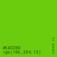 Цвет #6ACC0D в цветовой модели RGB обозначается тремя октетами (106, 204, 13) в десятичном формате и #6ACC0D в шестнадцатиричном (hex) формате, которые являются интенсивностью красного 106 (hex 6A), интенсивность зелёного 204 (hex CC) и интенсивность синего 13 (hex 0D).