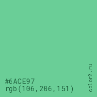 Цвет #6ACE97 в цветовой модели RGB обозначается тремя октетами (106, 206, 151) в десятичном формате и #6ACE97 в шестнадцатиричном (hex) формате, которые являются интенсивностью красного 106 (hex 6A), интенсивность зелёного 206 (hex CE) и интенсивность синего 151 (hex 97).