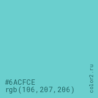 Цвет RGB(106, 207, 206) в процентом отношении количества цвета состоит из 41.6% красного (red), 81.2% зелёного (green) и 80.8% синего (blue).