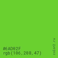 Цвет #6AD02F в цветовой модели RGB обозначается тремя октетами (106, 208, 47) в десятичном формате и #6AD02F в шестнадцатиричном (hex) формате, которые являются интенсивностью красного 106 (hex 6A), интенсивность зелёного 208 (hex D0) и интенсивность синего 47 (hex 2F).