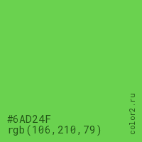 Цвет #6AD24F в цветовой модели RGB обозначается тремя октетами (106, 210, 79) в десятичном формате и #6AD24F в шестнадцатиричном (hex) формате, которые являются интенсивностью красного 106 (hex 6A), интенсивность зелёного 210 (hex D2) и интенсивность синего 79 (hex 4F).