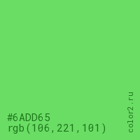 Цвет #6ADD65 в цветовой модели RGB обозначается тремя октетами (106, 221, 101) в десятичном формате и #6ADD65 в шестнадцатиричном (hex) формате, которые являются интенсивностью красного 106 (hex 6A), интенсивность зелёного 221 (hex DD) и интенсивность синего 101 (hex 65).
