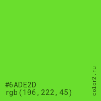 Цвет #6ADE2D в цветовой модели RGB обозначается тремя октетами (106, 222, 45) в десятичном формате и #6ADE2D в шестнадцатиричном (hex) формате, которые являются интенсивностью красного 106 (hex 6A), интенсивность зелёного 222 (hex DE) и интенсивность синего 45 (hex 2D).