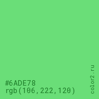 Цвет #6ADE78 в цветовой модели RGB обозначается тремя октетами (106, 222, 120) в десятичном формате и #6ADE78 в шестнадцатиричном (hex) формате, которые являются интенсивностью красного 106 (hex 6A), интенсивность зелёного 222 (hex DE) и интенсивность синего 120 (hex 78).