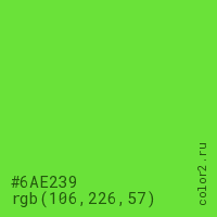 Цвет #6AE239 в цветовой модели RGB обозначается тремя октетами (106, 226, 57) в десятичном формате и #6AE239 в шестнадцатиричном (hex) формате, которые являются интенсивностью красного 106 (hex 6A), интенсивность зелёного 226 (hex E2) и интенсивность синего 57 (hex 39).