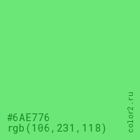 Цвет #6AE776 в цветовой модели RGB обозначается тремя октетами (106, 231, 118) в десятичном формате и #6AE776 в шестнадцатиричном (hex) формате, которые являются интенсивностью красного 106 (hex 6A), интенсивность зелёного 231 (hex E7) и интенсивность синего 118 (hex 76).