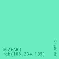 Цвет #6AEABD в цветовой модели RGB обозначается тремя октетами (106, 234, 189) в десятичном формате и #6AEABD в шестнадцатиричном (hex) формате, которые являются интенсивностью красного 106 (hex 6A), интенсивность зелёного 234 (hex EA) и интенсивность синего 189 (hex BD).