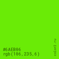 Цвет #6AEB06 в цветовой модели RGB обозначается тремя октетами (106, 235, 6) в десятичном формате и #6AEB06 в шестнадцатиричном (hex) формате, которые являются интенсивностью красного 106 (hex 6A), интенсивность зелёного 235 (hex EB) и интенсивность синего 6 (hex 06).
