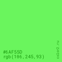 Цвет #6AF55D в цветовой модели RGB обозначается тремя октетами (106, 245, 93) в десятичном формате и #6AF55D в шестнадцатиричном (hex) формате, которые являются интенсивностью красного 106 (hex 6A), интенсивность зелёного 245 (hex F5) и интенсивность синего 93 (hex 5D).