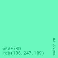 Цвет #6AF7BD в цветовой модели RGB обозначается тремя октетами (106, 247, 189) в десятичном формате и #6AF7BD в шестнадцатиричном (hex) формате, которые являются интенсивностью красного 106 (hex 6A), интенсивность зелёного 247 (hex F7) и интенсивность синего 189 (hex BD).