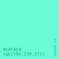 Цвет #6AFAD4 в цветовой модели RGB обозначается тремя октетами (106, 250, 212) в десятичном формате и #6AFAD4 в шестнадцатиричном (hex) формате, которые являются интенсивностью красного 106 (hex 6A), интенсивность зелёного 250 (hex FA) и интенсивность синего 212 (hex D4).