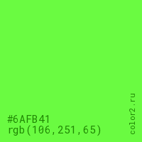 Цвет #6AFB41 в цветовой модели RGB обозначается тремя октетами (106, 251, 65) в десятичном формате и #6AFB41 в шестнадцатиричном (hex) формате, которые являются интенсивностью красного 106 (hex 6A), интенсивность зелёного 251 (hex FB) и интенсивность синего 65 (hex 41).