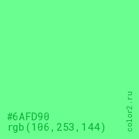 Цвет #6AFD90 в цветовой модели RGB обозначается тремя октетами (106, 253, 144) в десятичном формате и #6AFD90 в шестнадцатиричном (hex) формате, которые являются интенсивностью красного 106 (hex 6A), интенсивность зелёного 253 (hex FD) и интенсивность синего 144 (hex 90).