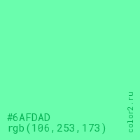 Цвет #6AFDAD в цветовой модели RGB обозначается тремя октетами (106, 253, 173) в десятичном формате и #6AFDAD в шестнадцатиричном (hex) формате, которые являются интенсивностью красного 106 (hex 6A), интенсивность зелёного 253 (hex FD) и интенсивность синего 173 (hex AD).