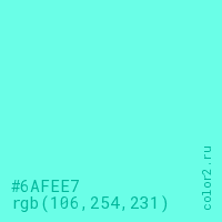 Цвет #6AFEE7 в цветовой модели RGB обозначается тремя октетами (106, 254, 231) в десятичном формате и #6AFEE7 в шестнадцатиричном (hex) формате, которые являются интенсивностью красного 106 (hex 6A), интенсивность зелёного 254 (hex FE) и интенсивность синего 231 (hex E7).