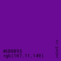 Цвет #6B0B95 в цветовой модели RGB обозначается тремя октетами (107, 11, 149) в десятичном формате и #6B0B95 в шестнадцатиричном (hex) формате, которые являются интенсивностью красного 107 (hex 6B), интенсивность зелёного 11 (hex 0B) и интенсивность синего 149 (hex 95).