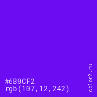 Цвет #6B0CF2 в цветовой модели RGB обозначается тремя октетами (107, 12, 242) в десятичном формате и #6B0CF2 в шестнадцатиричном (hex) формате, которые являются интенсивностью красного 107 (hex 6B), интенсивность зелёного 12 (hex 0C) и интенсивность синего 242 (hex F2).